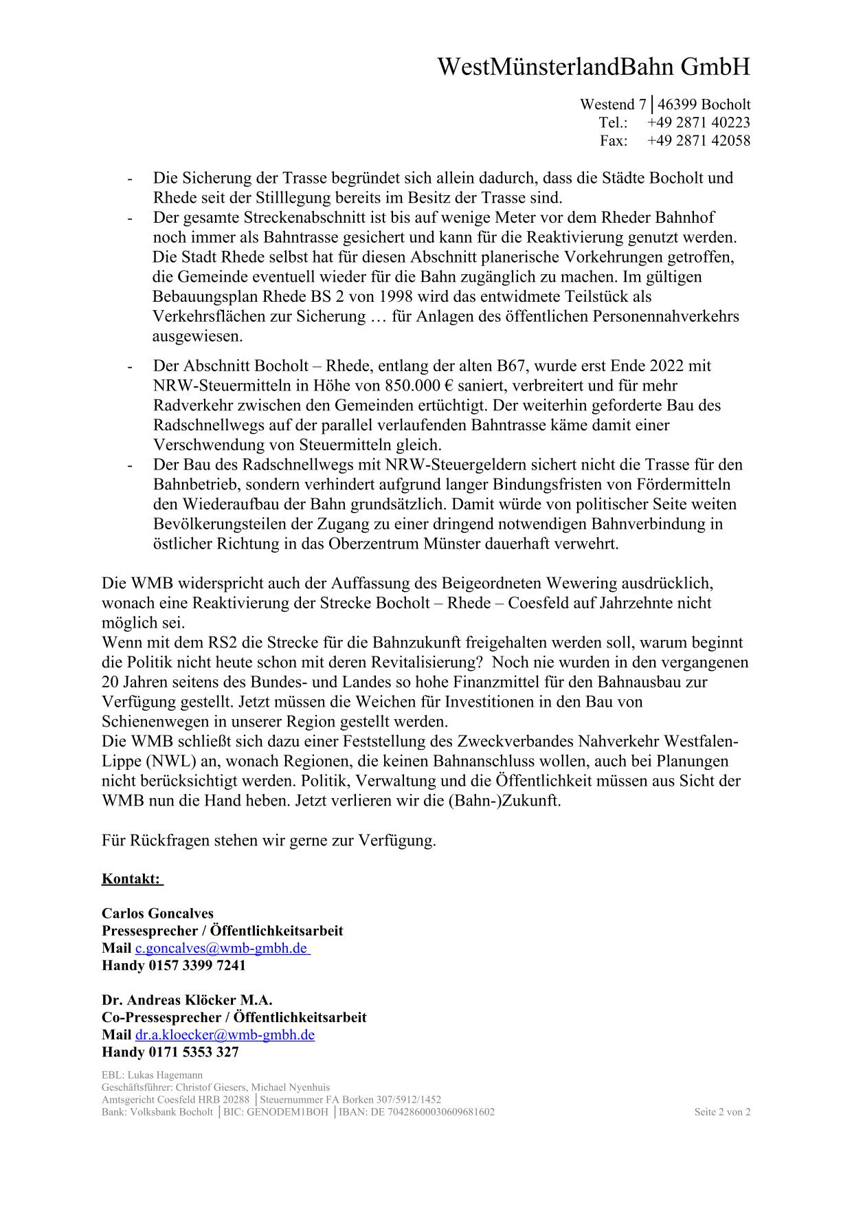 Am 11.08.2023 berichtete das BB, dass der Regionalplanentwurf sich für den Bau des Radschnellwegs ausspricht. Die Stadt Rhede hält am RS2 fest und verbindet damit eine angebliche deutliche Reduzierung des motorisierten Individualverkehrs. Der RS2 sei ein Mehrwert für das Westmünsterland. In den Fokus rückt Rhede auch die Auffassung, dass der RS2 die Bahntrasse für einen späteren Schienenverkehr sichere, da - besonders der Beigeordnete Wewering betont dieses immer wieder - die Bahn auch in den nächsten Jahrzehnten nicht realisierbar sei.